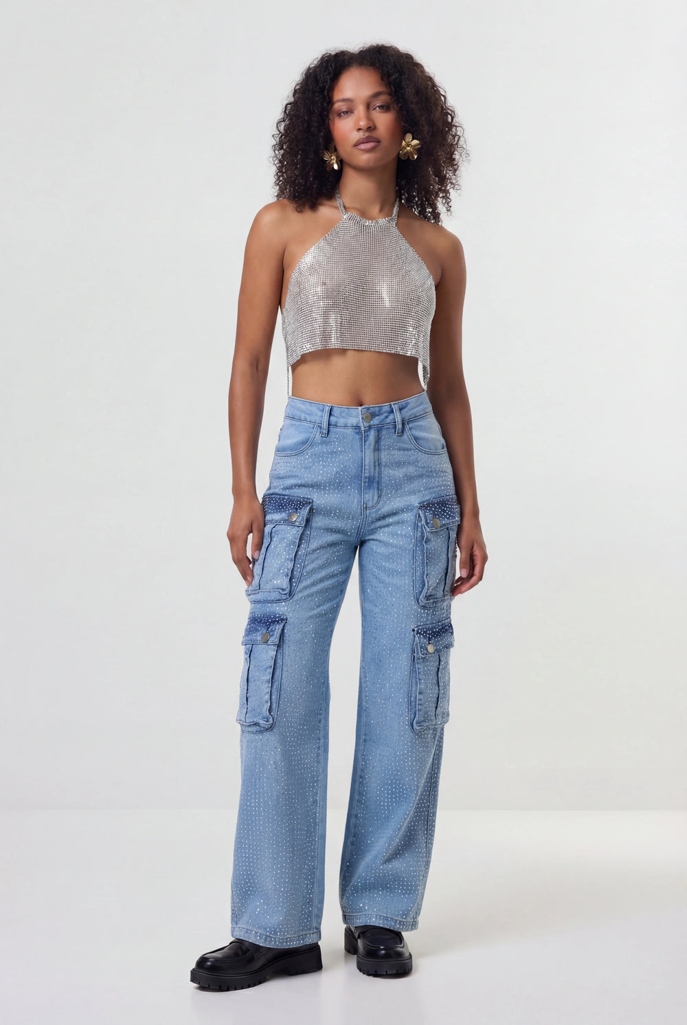 Inspirada na tendência da calça cargo feminina, a Lia possui bolsos utilitários que reforçam a estética contemporânea da peça. A modelagem confortável valoriza a silhueta enquanto o jeans com brilho adiciona um toque marcante ao look.