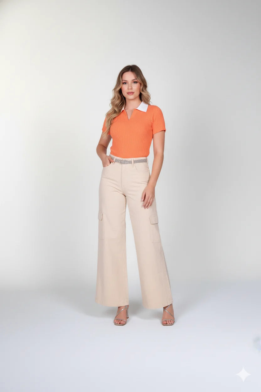 Cintura alta, pernas amplas e bolsos laterais funcionais. O shape alonga a silhueta e cria um visual clean e sofisticado.